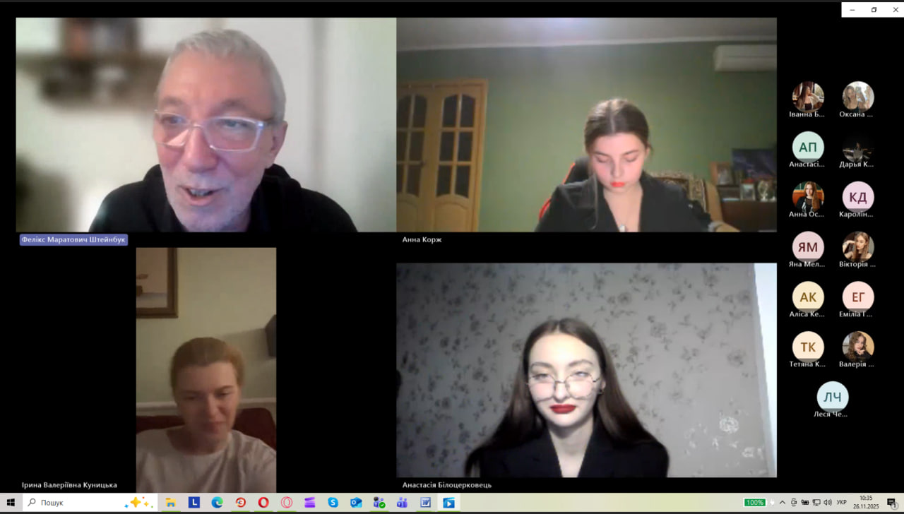 25 листопада 2025 року відбулося спільне засідання літературного гуртка "Література і війна" під керівництвом проф. Штейнбука. Цього разу засідання відбувалося у форматі подкасту, спікерками якого виступили студентка 1-го курсу Анна Корж та студентка 2-го курсу Анастасія Білоцерковець, і було присвячено розгляду книги Юлії Ілюхи "Мої жінки". І хоча це була перша така спроба, однак відео з подкасту тільки за перші пів доби у ФБ набрало більше, ніж пів тисячі переглядів! Тож сподіваємося, що гуртківці на цьому не зупиняться!